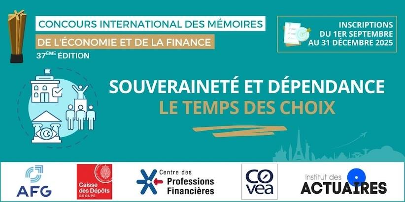 L’Institut des actuaires est partenaire du 37e Concours international des mémoires de l’Économie et de la Finance (CIMEF) organisé par le Centre des Professions Financières, sur le thème « Souveraineté et dépendance : l’heure des choix ». Depuis le 1er septembre, et jusqu’au 31 décembre 2025, les candidatures sont ouvertes pour les mémoires de M1 ou M2 rédigés en français ou en anglais, soutenus depuis le 1er janvier 2025 et ayant obtenu une note supérieure ou égale à 15/20 ou B+. Le concours, doté de 25 000 euros de prix partagés entre les 5 lauréats et leurs formations, s’adresse à un large ensemble de cursus scientifiques, dont l’actuariat, régulièrement récompensé.